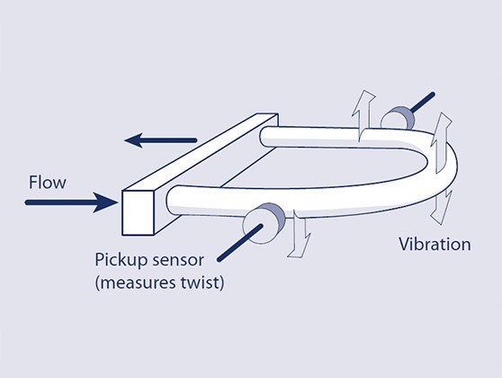 2. 科里奧利流量計是如何工作的?科里奧利效應適用于更“實際”的應用:氣體和液體質量流量測量。為此,將需測量的流體流經(jīng)振蕩管。 在科里奧利裝置中,致動器驅動振蕩管圍繞其固有頻率連續(xù)振動。隨管放置的兩個傳感器實時測量振蕩管的偏轉。無流量流經(jīng)振蕩管時,兩個傳感器在同一時刻測量相同的偏轉。當氣體或液體流過振蕩管時,由于慣性,流體質量會對管道造成額外的扭曲。兩者之間的區(qū)別被稱為“相移”,是對通過管道的質量流量的直接測量。相移與質量流量成正比:相移越大是質量流量越大的結果。 基于科里奧利效應的質量流量裝置還可以測量流體密度!相移是質量流量的度量,而振動(固有)頻率是流體密度的度量。流體密度會影響振蕩管的振動頻率:密度較大的流體比密度較小的流體振動的頻率更低。振動頻率是液體或氣體密度的直接測量。質量流量和密度是使用相同的設備相互獨立地測量的,說明科里奧利流量計的多功能性。 |
