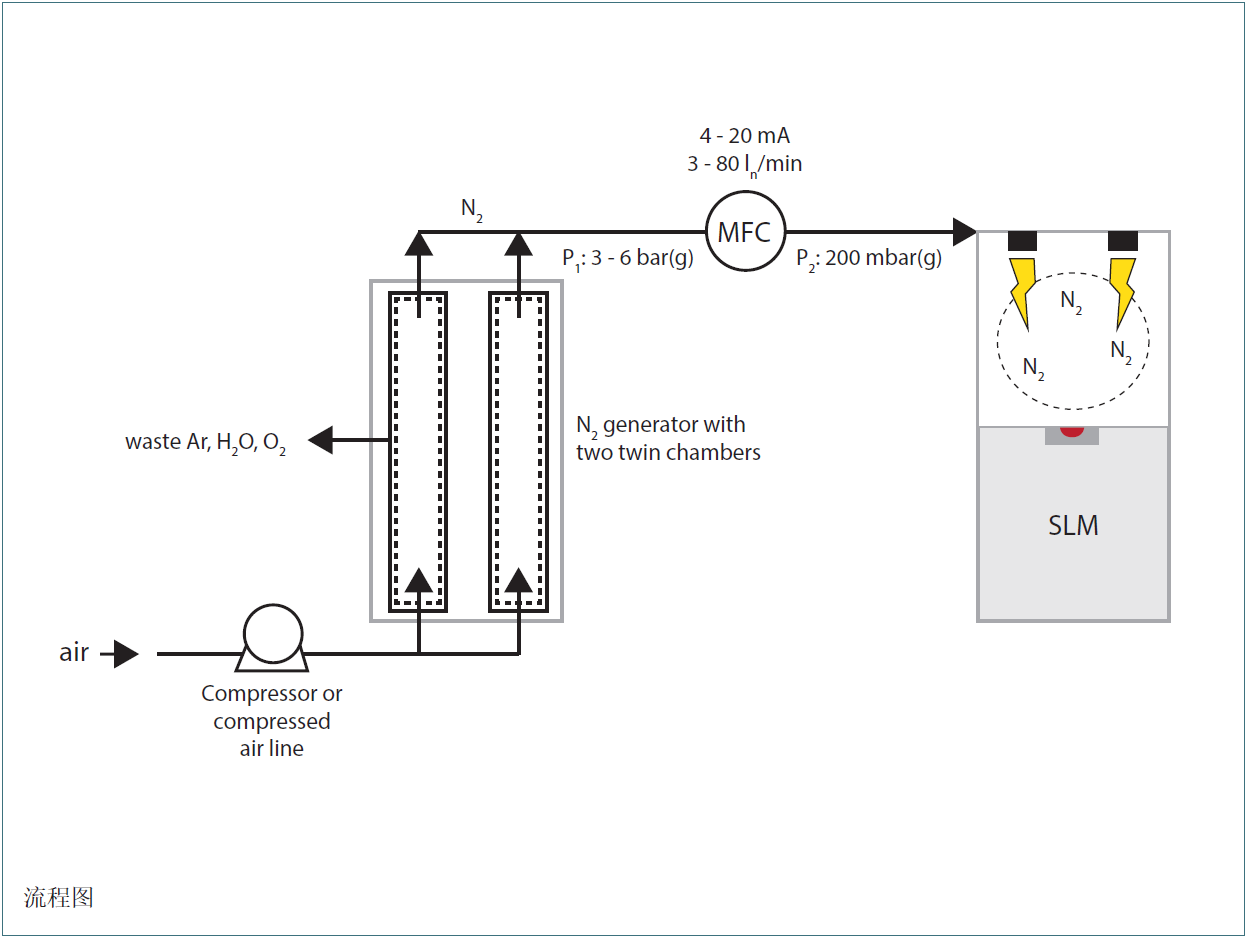 對于SLM 3D打印機(jī)的最終用戶,有兩種方式可以建立氮?dú)饪辗郑簛碜詢?nèi)部的氮?dú)夤?yīng)源(如果存在),或是作為3D打印機(jī)附件的氮?dú)獍l(fā)生器。Bronkhorst參與到了后一個選擇中。來自壓縮空氣源或者壓縮機(jī)的加壓空氣被供給到氮?dú)獍l(fā)生器,其分子篩將空氣流分成兩股流。除去氧氣、水蒸氣和氬氣等成分,保留高純度(5.0級)的氮?dú)狻?/p>
