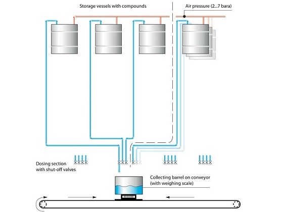 傳統(tǒng)稱重法傳統(tǒng)上,質(zhì)量/體積的劑量通過使用帶有磅秤/天平的截止閥來實(shí)現(xiàn)。稱重秤置于閥門出口噴嘴下方,經(jīng)過調(diào)零程序后,閥門打開。稱重秤向PLC或控制單元發(fā)送信號,當(dāng)批次達(dá)到時(shí),閥門將關(guān)閉。 |